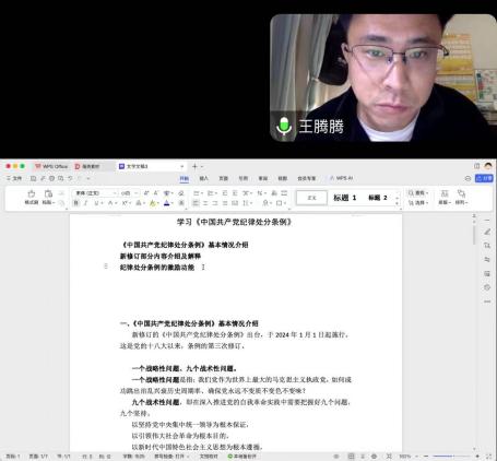 王腾腾同志介绍了新修订的《中国共产党纪律处分条例》的历史沿革、内容变化和激励功能。他详细分析了纪法分开、纪法衔接、纪法贯通的机制演进和历史变迁,并从激励功能的维度切入,对条例的修订特点、党内法规与国家法律之间的区别进行重点解读,深化了支部成员对党内法规的理解。