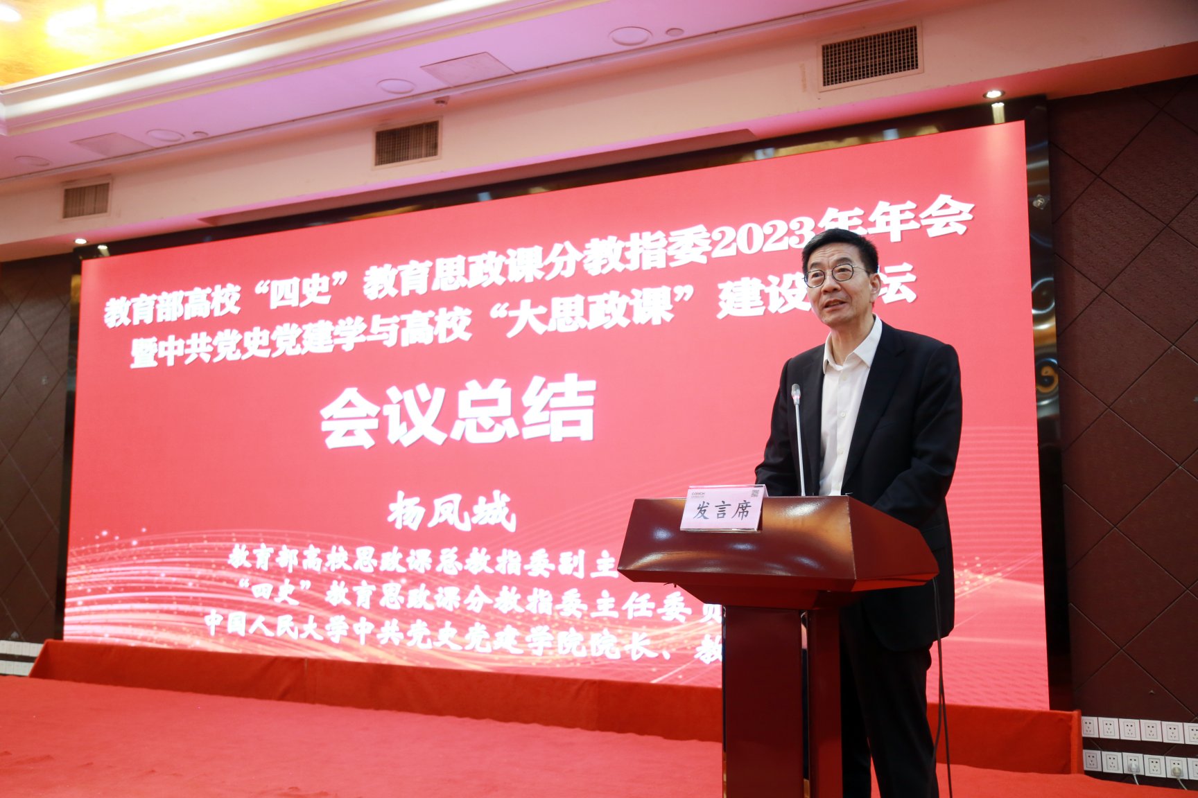 大会闭幕式由“四史”教育思政课分教指委秘书、永利集团副经理、《教学与研究》学术副主编耿化敏主持。华南师范大学马克思主义公司副经理胡国胜教授、中南民族大学马克思主义公司易新涛教授、扬州大学当代中国民主政治研究中心主任周建超教授代表各分论坛进行综述汇报。杨凤城教授作大会总结,指出本次年会紧扣主题,进行热烈而深入的交流探讨,不仅碰撞出很多的新观点、新思路、新方法,也进一步凝聚推动高校“四史”类课程建设、中共党史党建学团队建设与高校“大思政课”建设一体化发展的广泛共识,提出“四史”类课程优化设置、思政课团队培训进修、深化党史党建研究、加强党史党建学科对思政课支撑、完善工作联系服务机制等建议和主张,充分彰显了广大高校思政课教师和中共党史党建学教学研究工作者积极主动地建构中国自主的知识体系,发挥思政课立德树人关键课程、中共党史党建学资政育人作用的责任与担当,必将进一步推动课程建设与团队建设的高质量发展。闭幕式还宣布2024年分教指委年会将在贵州师范大学举办。