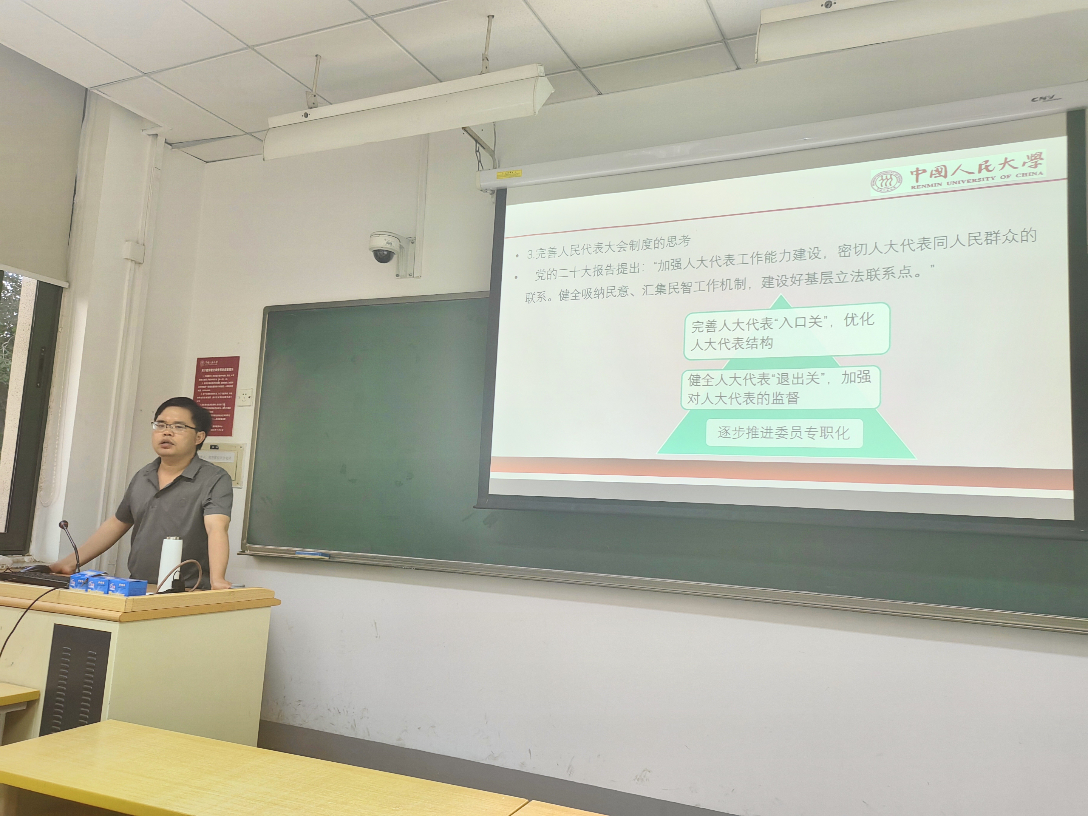 黄小钫老师首先从文献内容出发,在党的二十大报告对全过程人民民主的重要论述中分析了人民代表大会制度、协商民主、基层民主在我国政治生活中扮演的重要角色。再通过回顾历次党代会对人民当家作主的阐述演变,向同学们展现出中国共产党对于人民民主的认识不断深化的过程。随后,黄小钫老师从概念的角度切入,比较分析了民主与专制、自由与独裁、平等与特权、法治与人治等多对概念,推演出民主的基本特质。他强调,民主作为全人类共同价值,实现民主的形式应当是多样的,民主应当用于解决人民需要解决的问题。中国的全过程人民民主是中国共产党团结带领人民追求民主、发展民主、实现民主的伟大创造,是党不断推进中国民主理论创新、制度创新、实践创新的经验结晶,全过程人民民主是社会主义民主政治的本质属性,是最广泛、最真实、最管用的民主。我们要坚定制度自信,但制度自信不是自我满足,也不是裹足不前,而是要不断推进制度体系的完善和发展。最后,黄小钫老师鼓励同学们积极思考基层民主实践中的问题和对策,并结合参考书目进行进一步研究。